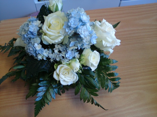 Så skulle det settes opp bord og dekkes opp, og jeg sender en stoooor takk til Silje og Inger Johanne som stilte opp og hjalp meg med dette! Mens jeg satte opp blomsterdekorasjoner dekte de bordene, og til slutt brettet jeg servietter i vifteform. Tatt i betrakning at jeg ikke har satt opp dekorasjoner på over 6 år, syns jeg de ble ganske bra! Den på bildet ble ikke den fineste, men ble ikke så værst den heller 😉 Vi hadde hvite duker med lyseblå løper på, og så spredte jeg krystall-lignende stener langs midten av bordet.