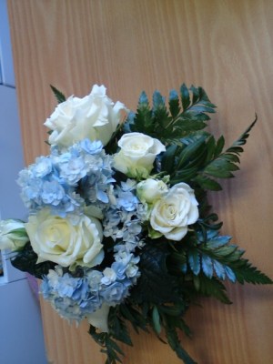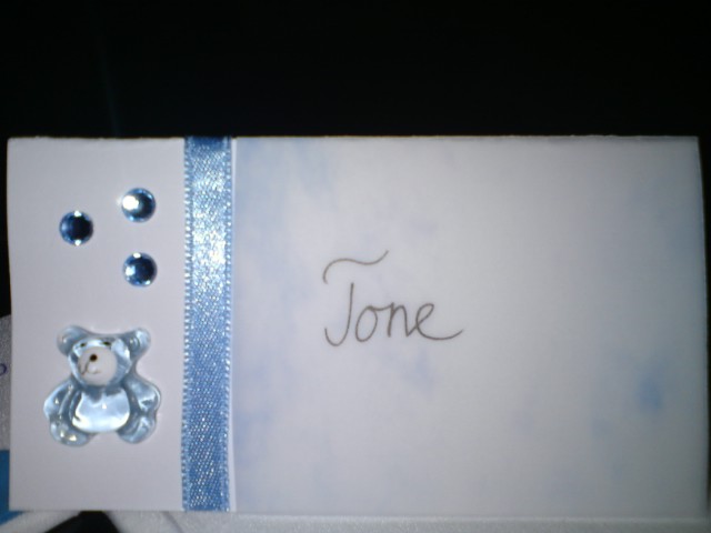 Bordkort måtte også fikses, og min kjære mamma stilte gladelig opp. Hun er kreativiteten selv, og er veldig flink med hobby-saker, og da med bordkort som en av sine spesialiteter. Jeg ante ikke hvordan jeg ville ha dem, men under en shoppingrunde med mamma fant vi både inspirasjon og materialer. Så var det bare å sette seg ned å fikse dem! Mye arbeid, men mamma gjorde prestasjonsarbeidet, mens jeg limte på bling og bamse. hehe.. Vi fant et nydelig gjennomsiktig papir med lyseblå marmorering som vi limte delvis over et hvitt ark. Marmorering-arket limtes bare øverst så det hang løst, og det gjorde bordkortet mer levende. Så limte mamma på blå silkebånd, og jeg limte på blå «diamanter» og lyseblå bjørner. Ble skikkelig fint!