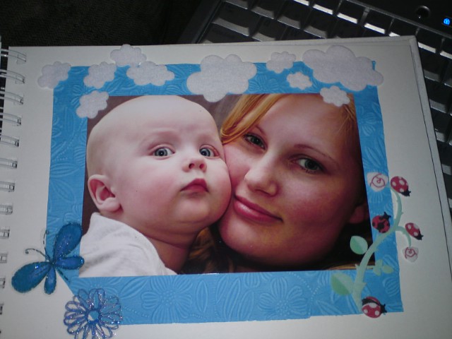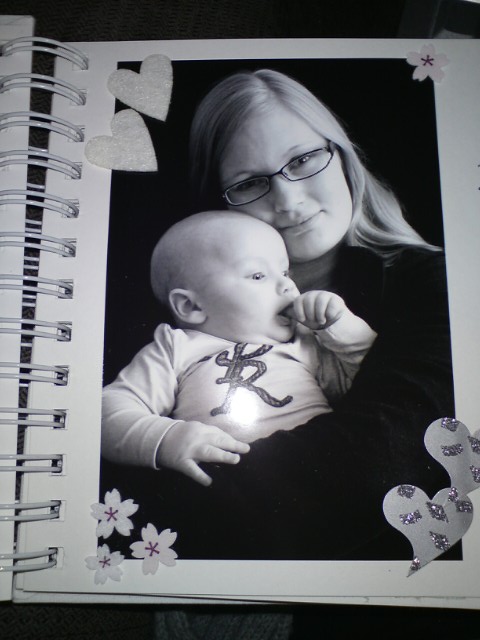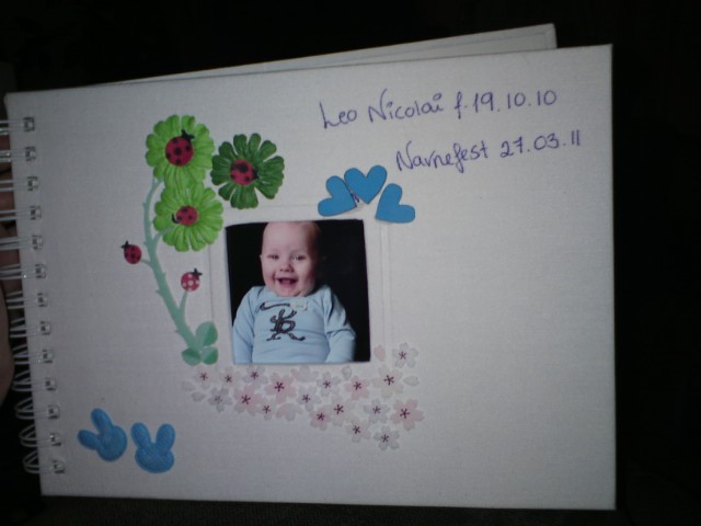 Jeg fant også ut at jeg skulle lage minnebok til lillegull som folk kunne skrive hilsner i. Og når jeg bestemmer meg for å gjøre noe blir det som regel aldri halvveis, så da tenkte jeg at scrapping kunne være en god idè! Så bar det ut for å kjøpe inn utstyr, og takk gud for salg, sier jeg bare!!! Jeg måtte også skrive ut bilder i papirform som jeg kunne lime inn i boka, og det tok TID! To kvelder satt jeg, og det var to kvelder som egentlig burde brukes til andre ting. Men bra ble det, og så vidt jeg kan se nå så skrev alle hilsner i den 🙂 Jeg syns i alle fall det var vel verdt tiden jeg brukte på den, og angret kun da jeg satt og jobbet med den.. hehe..