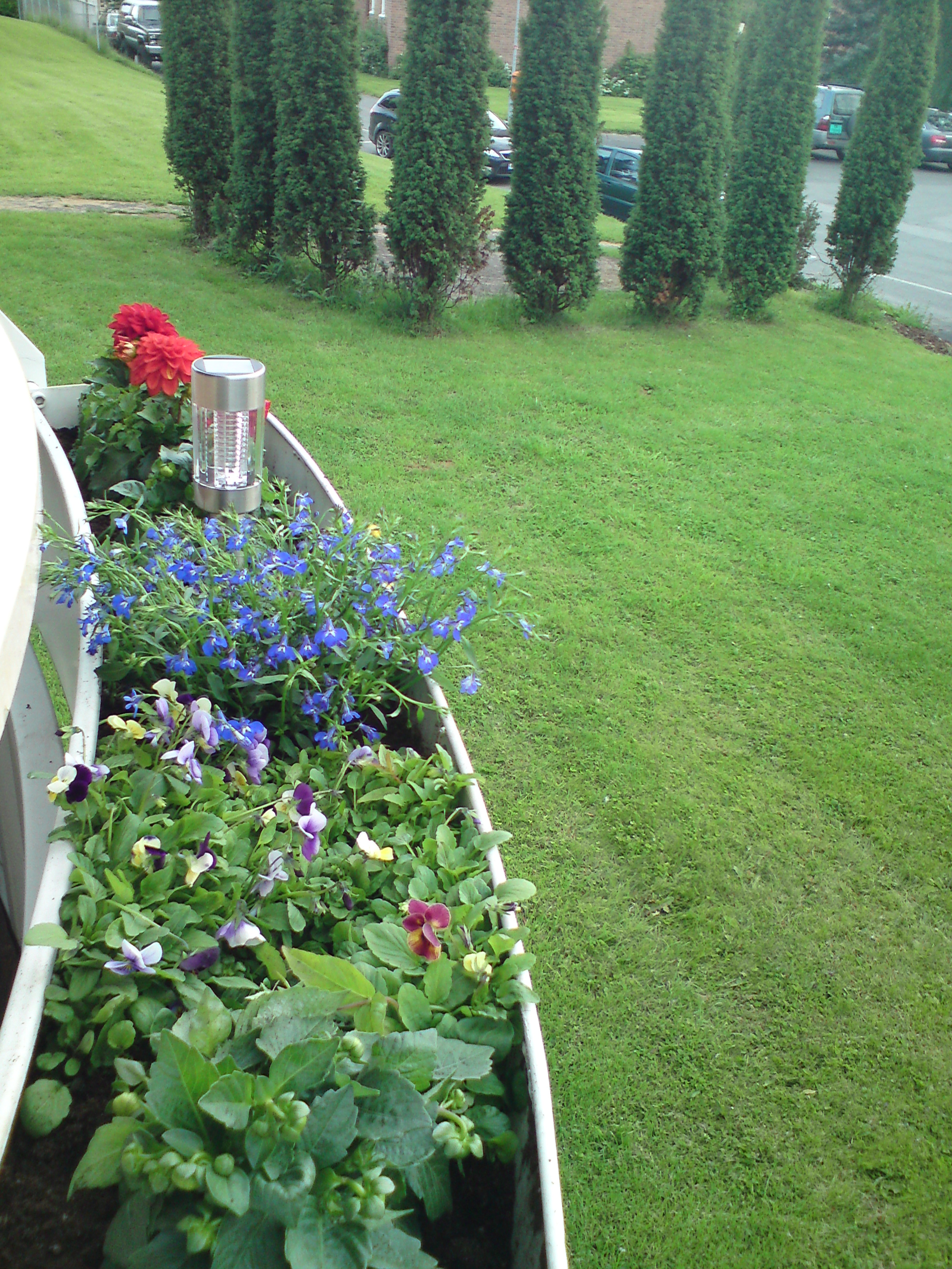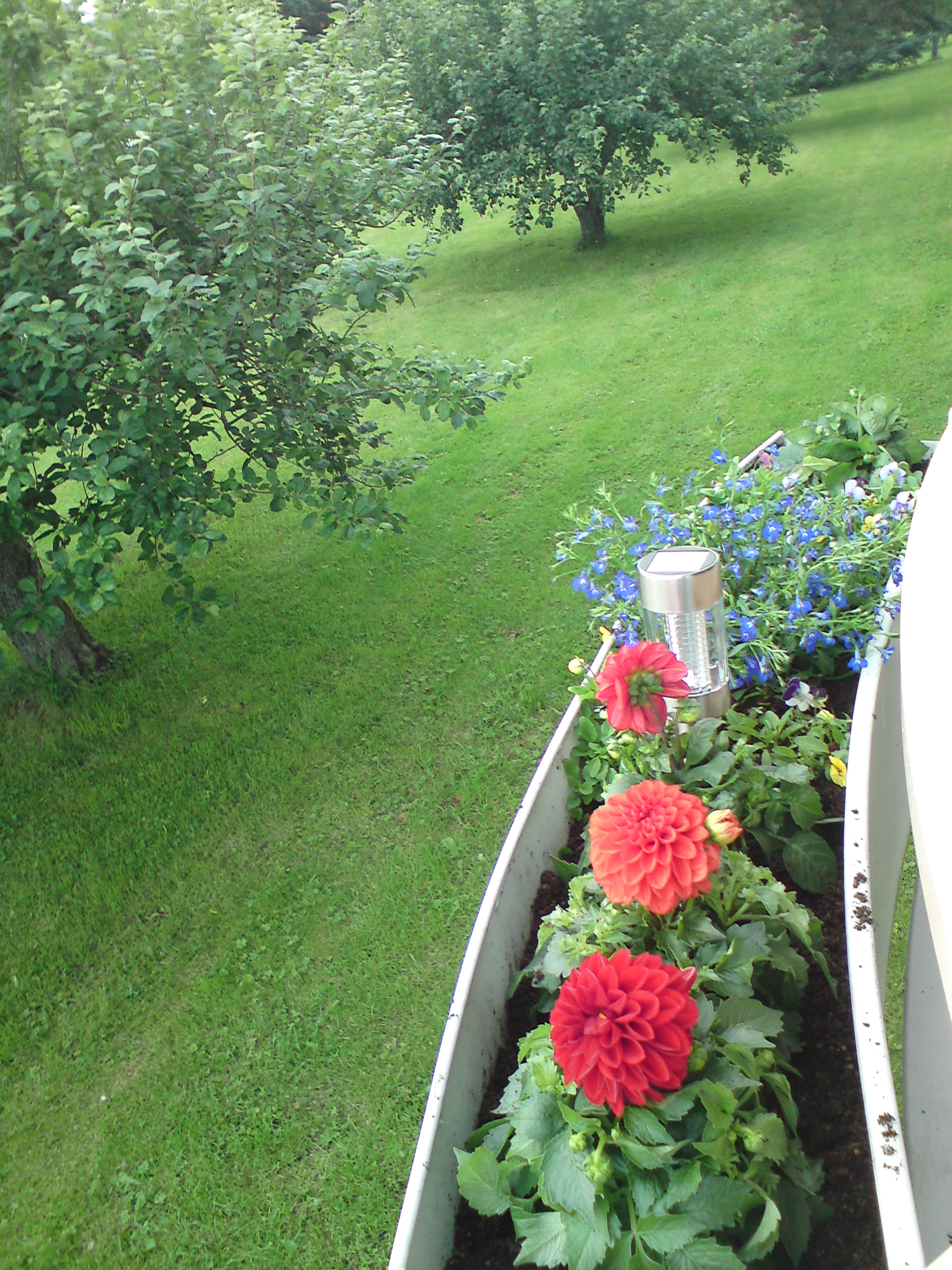 Etter matingen møtte vi svigers for å spise middag på en kro utenfor byen, og på vei hjem stoppet jeg og sambo på plantasjen. Vi skal kjøpe oss hagemøbler til balkongen, og ville se hva de hadde. Vi fant drømmesettet til en bra pris, så nå er det bare å kjøpe det inn! Hadde ikke plass i dag, så vi får ta det en annen dag. Jeg fant også hengekrukke til eføyen min som skal henge i kjøkkenvinduet, og den passet perfekt! Nå henger den så fint så. Jeg bestemte meg også for at nå var det på tide å fikse verandakassen vår, så vi kjøpte 5 planter, en sekk med jord, hageutstyr, hagehansker og gjødsel. Jeg har til dags dato ALDRI plantet en eneste plante før, og slett ikke i en verandakasse!!! Men jeg gikk på med vett i panne og mot i sinnet, og greide å plante alle plantene helt på egenhånd! (dog etter en kjapp telefon til bestemor, men jeg gjorde jobben selv!) Jeg satte også en lykt oppi kassen som drives av solenergi, og det ble et FLOTT resultat, om jeg må si det selv!! Jeg er SÅÅÅÅ stolt nå!!!!!! 😀