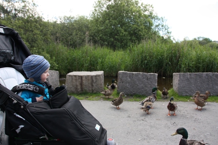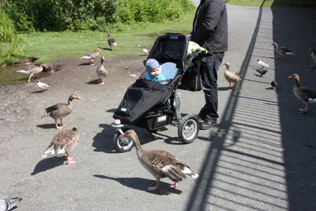 Da sambo sto opp noen timer etter oss hadde solen endelig stått opp, og han foreslo å ta oss en tur til østensjøvannet for å mate fuglene der. Siden det er fuglereservat er det mange forskjellige fugler der, alt fra ender, måker og duer til større fuler som canada-gjess og svaner. Vi stoppet på kiwi for å kjøpe med noe billig kneip vi kunne gi dem, and off we go. Når vi kom frem plasserte vi Leo i vognen og tuslet oss bortover. Vi stoppet i enden av parkeringsplassen og ble fort omringet av en stor flokk ender som luktet brød. Leo satt delvos begeistret og delvis skeptisk i vognen sin, men viste ingen tegn til frykt til tross for at endene kom omtrent oppi vogna hans. Etterhver kom vi oss bort til gjessene, og da startet dramaet for min del. Jeg har aldri vært særlig redd fugler, men jeg må innrømme at det å bli omringet av 30 sultne gjess som er på størrelse med svaner og som veser til meg ble i skumleste laget. Jeg prøvde å gjemme meg bak sambo, men måtte bare kapitulere.Etter å ha forsikret meg om at Leo var trygg hos sambo gikk jeg i høyt tempo bort fra horden med gjess. Kall meg feig, men du var ikke der å opplevde det! 😛 hehe…