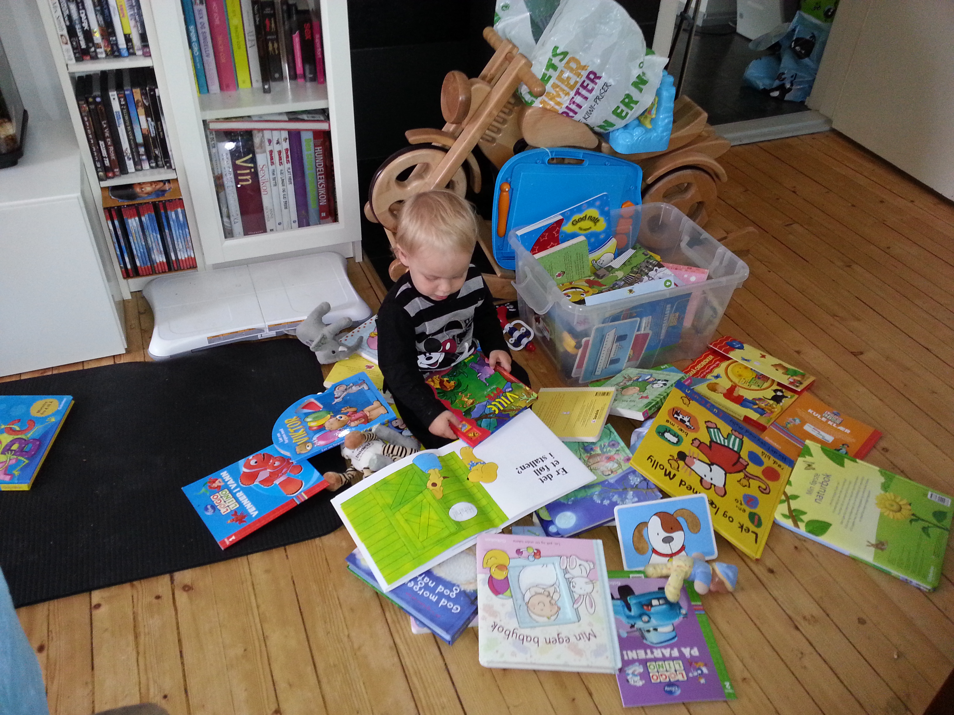 Nå kan det se ut som jeg har fått en liten etterfølger, og det er ingen tvil om at Leo elsker bøker! Jeg meldte ham inn i Goboken og Disneyklubben da han var bare en uke gammel, og det har resultert i mange herlige bøker. Jeg har også handlet MASSE på diverse mammutsalg og andre salg, og Leo har allerede en imponerende samling bøker! Det beste han vet er å spre dem utover gulvet og lese en og en. Slik kan han sitte en hel time! Vi har så smått begynt å lære ham alfabetet, så kanskje han gjør som mammaen sin og lærer seg å lese tidlig? 🙂
