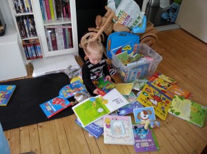 Han har en egen kasse med bøker på stua, så når han vil lese henter han seg en (eller mange) bøker der, og vil han at vi skal lese henter han boka han vil lese og bringer den til oss. 🙂