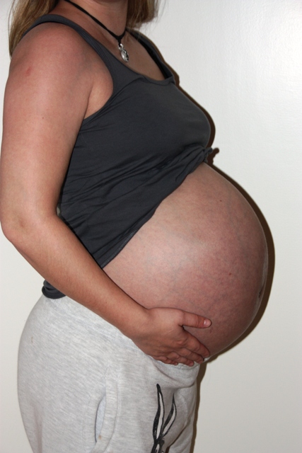 Vi kommer stadig nærmere termin, og det er vel på tide med et nytt magebilde. Siden jeg tok med klær på sist var planen å legge ut et uten klær denne gangen så dere får se hvordan magen ser ut uten. Fortsatt ingen strekkmerker på magen, og er veeeldig fornøyd med det!!! Keep up the good work, mage!! 😀 Les videre