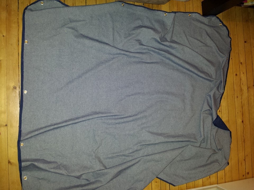 Med mot i blikket og angst i magen satte jeg igang med måling og klipping, bretting og isetting av nåler rundt hele. Teppet er 145 cm x 145 cm kvadratisk med avrundet kanter. Jeg sydde 1 cm kant inn rundt hele teppet, så banket jeg ikk nagler/metallhull så man kan trekke tråd gjennom og snøre det sammen.