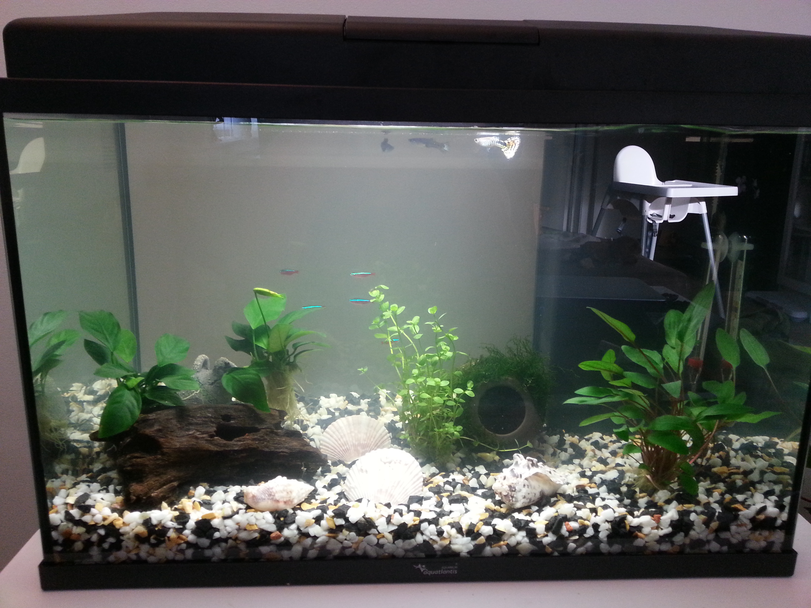 T: Hva er det med fisken din? (Tenker mitt om at den sikkert har blitt borte for hundredeogfemtiende gang, og at den ligger et sted det ikke er tenkelig at en liten fisk skal kunne ligge…)